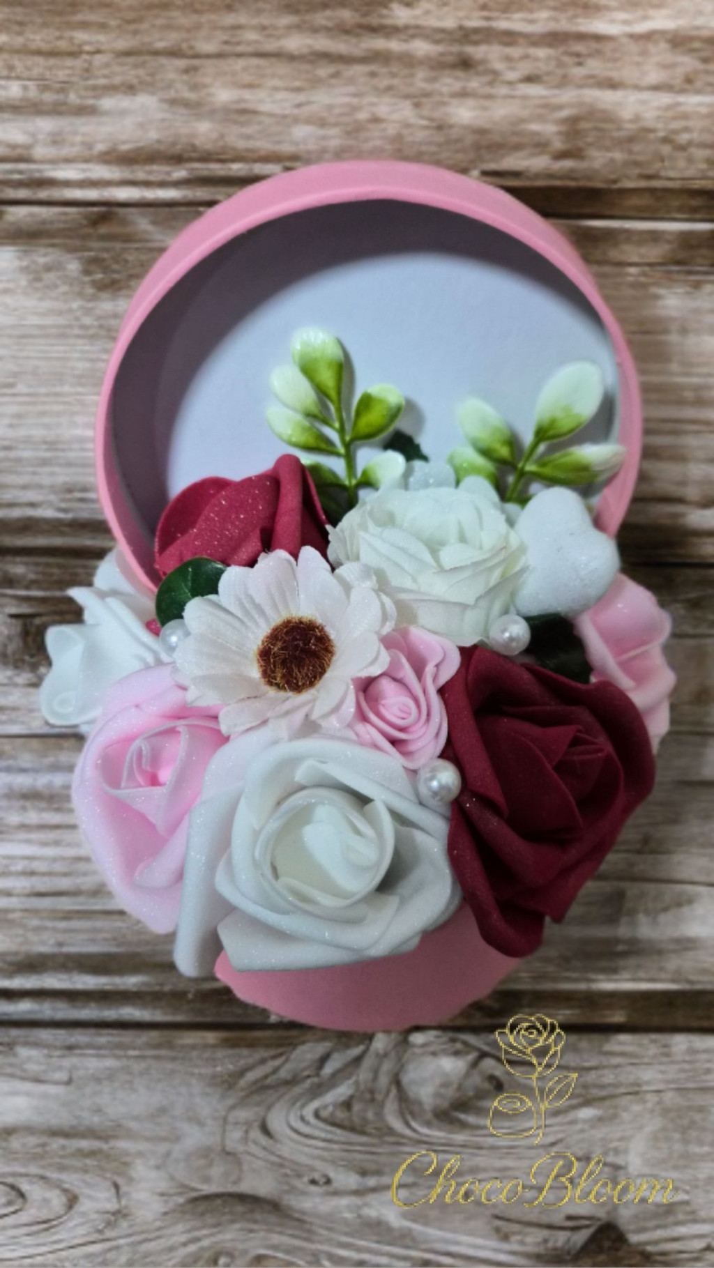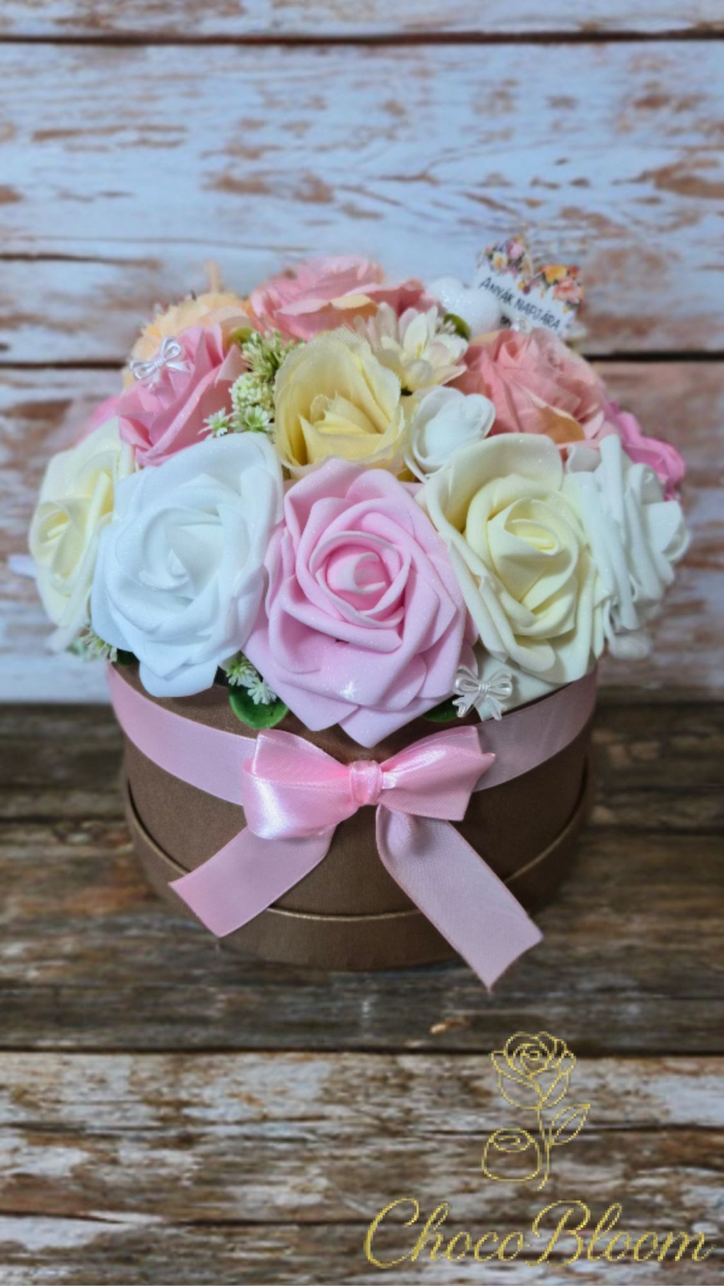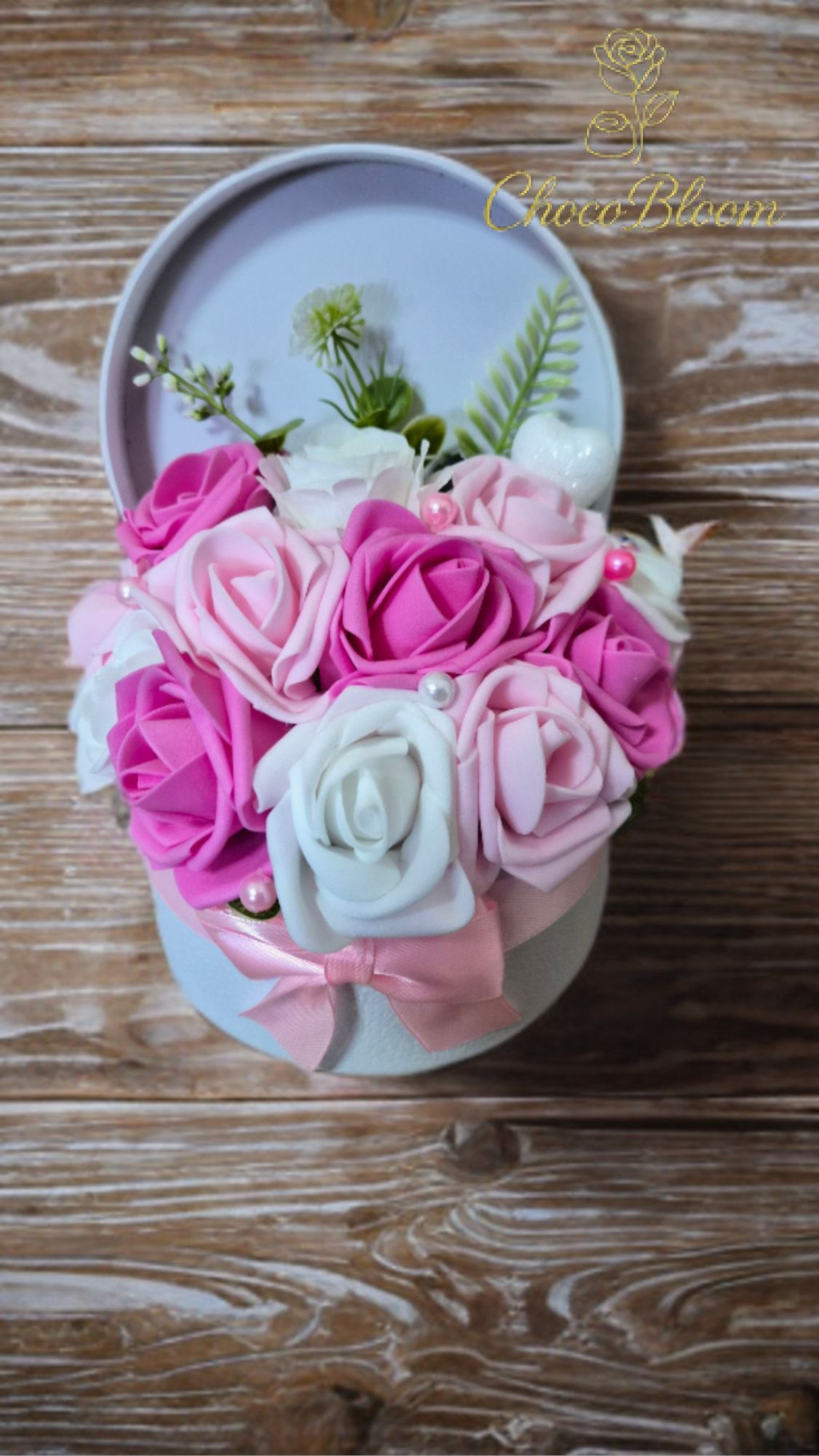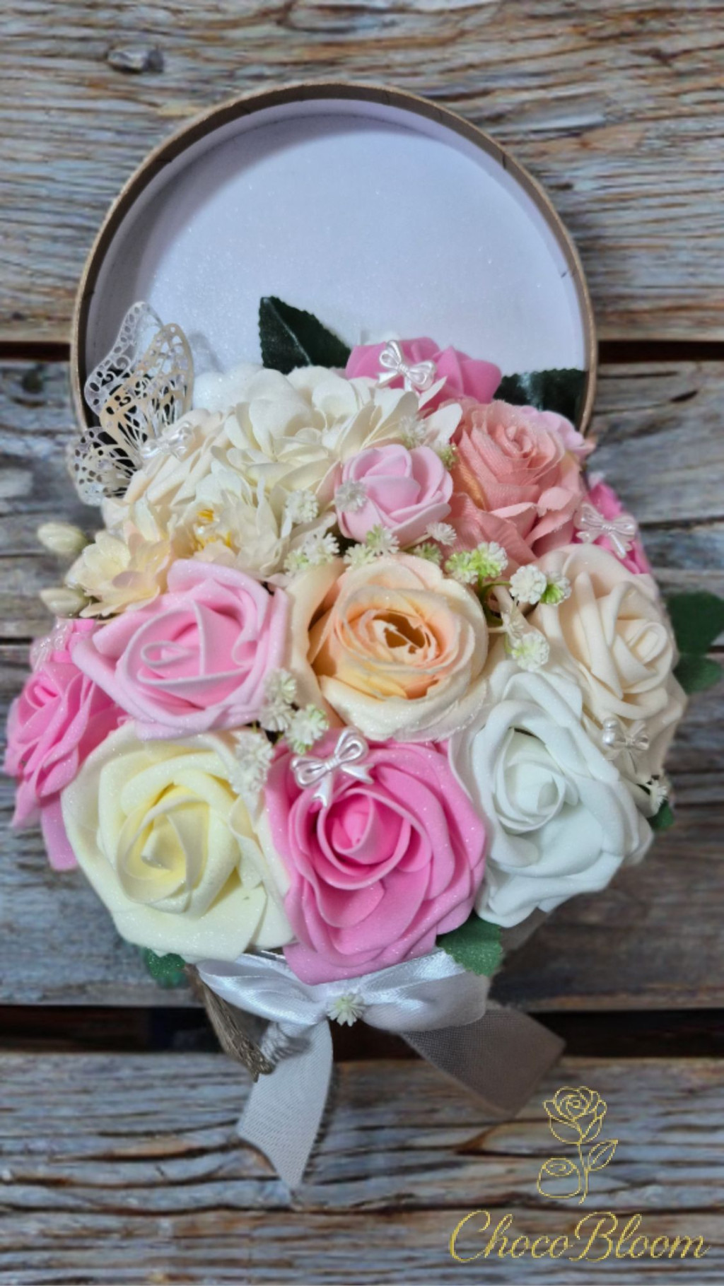 Virágbox gyönyörű virágokkal, masnival. Remek ajándék névnapra, születésnapra, anyák napjára, ballagásra.