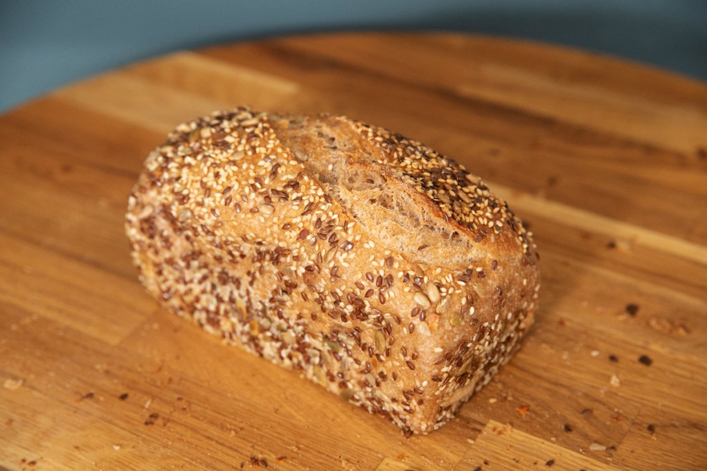 BIO teljes kiörlésű búzakenyérliszt, BL80-as búzakenyérliszt, 4 féle olajos mag (napraforgó-,szezám-, len-, tökmag) só, kovász