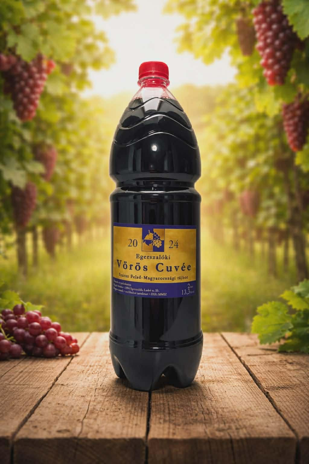 Egri Borvidéken saját termelésű szőlőből készült Vörös Cüvée száraz bor . (Zweigelt, Cabernet Sauvignon, Cabernet Fran, Bíborkadarka)